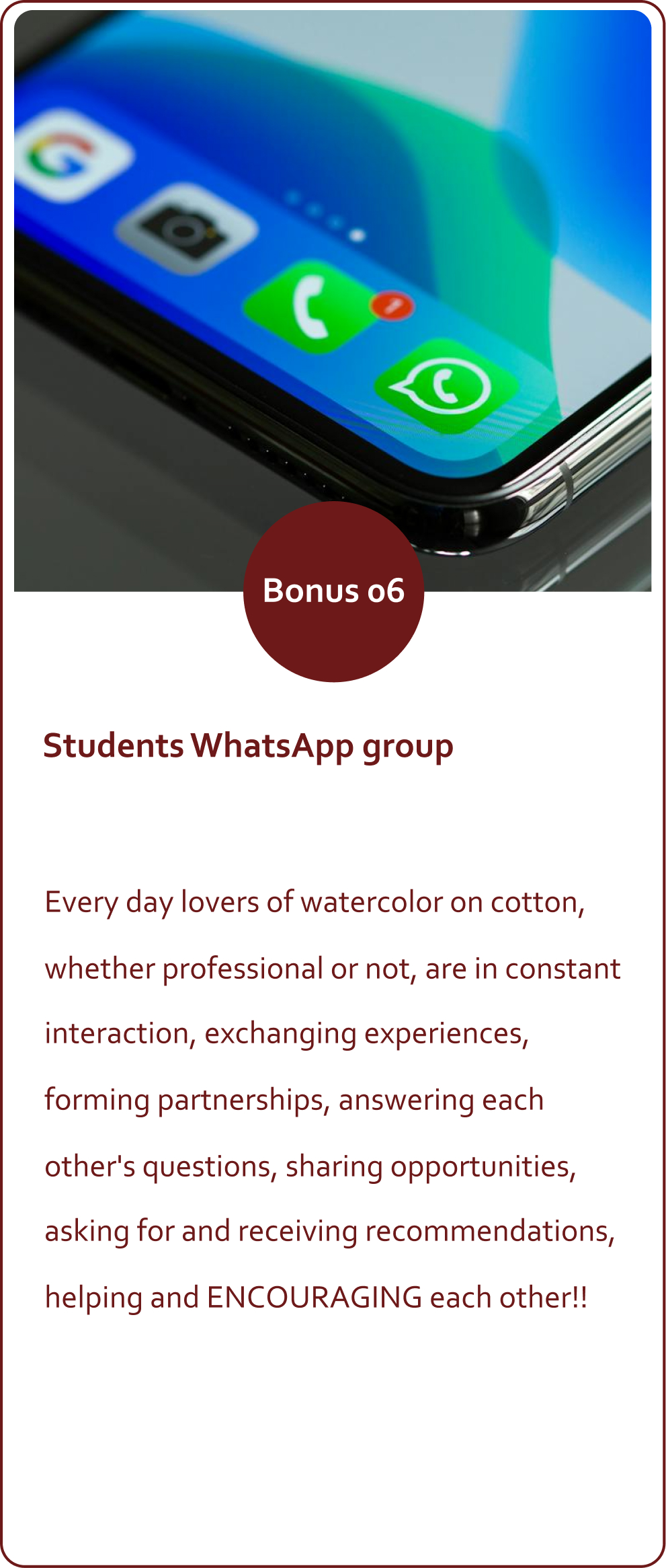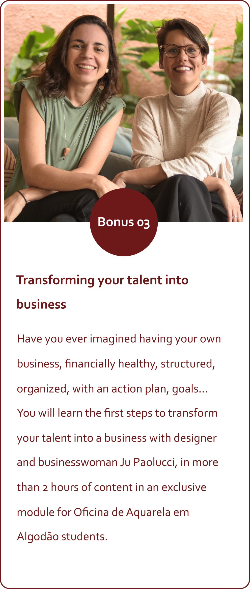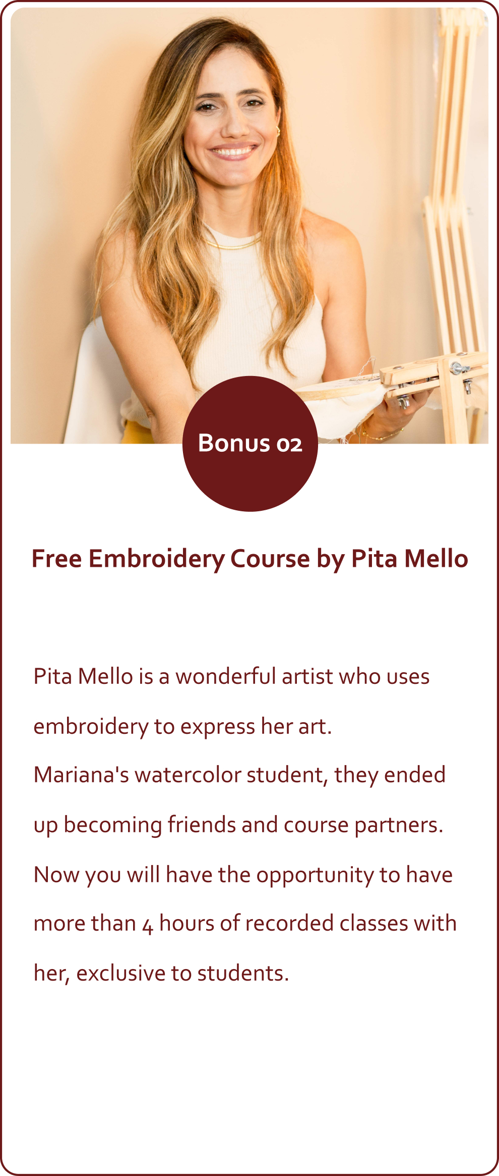 Além de toda técnica de Aquarela em Algodão, o curso ainda contempla um módulo de bordado livre para iniciantes da artista Pita Mello, acesso gratuito aos primeiros módulos do Curso de Foto Bordada, desenvolvido pela Eloíne Erthal da Natural Afeto e mais um módulo sobre como empreender com o seu talento, ministrado por Ju Paolucci, com acesso exclusivo dos inscritos.